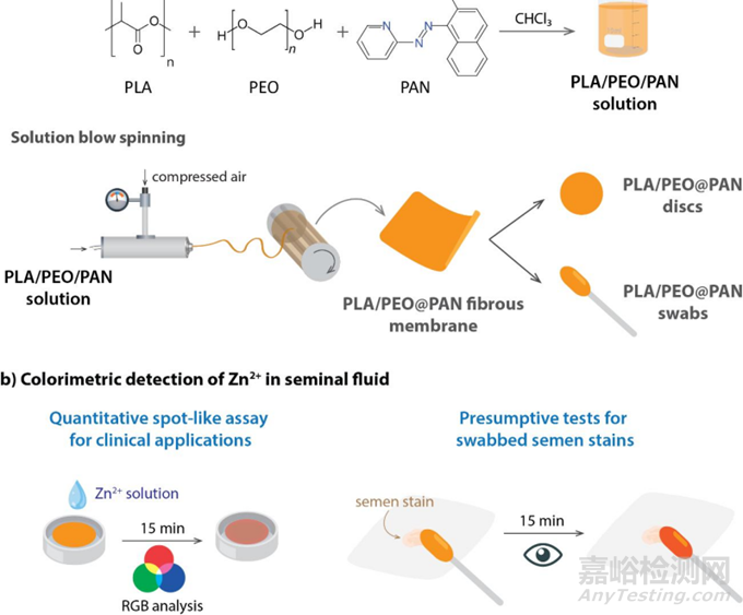 針對(duì)此,來(lái)自巴西巴伊亞聯(lián)邦大學(xué)化學(xué)研究所的L. A. Mercante和R. M. M. Santana團(tuán)隊(duì)提出了一種基于溶液吹紡技術(shù)的新型固態(tài)比色傳感器,用于精液中的鋅檢測(cè)。該傳感器具有便攜、操作簡(jiǎn)單、靈敏度高和選擇性好的優(yōu)點(diǎn),有望在臨床和法醫(yī)領(lǐng)域得到廣泛應(yīng)用。相關(guān)研究以“Blown spun fibers-based colorimetric sensor for detecting trace zinc in seminal fluid”為題發(fā)表在《Biosensors and Bioelectronics》上。