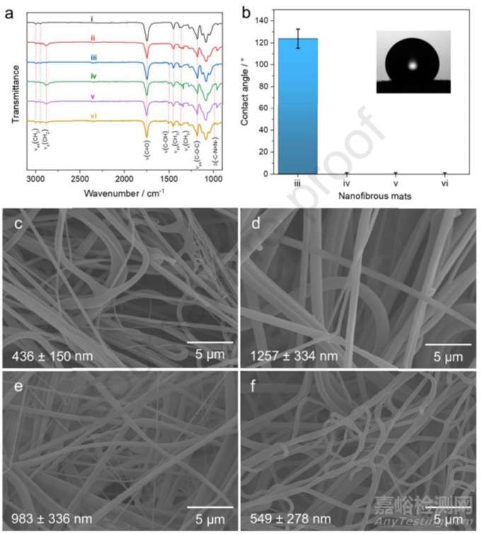 首先,使用掃描電子顯微鏡(SEM)觀察纖維膜的形態(tài),結(jié)果顯示膜具有隨機(jī)取向的平滑纖維表面。其次,通過(guò)傅里葉變換紅外光譜(FTIR)分析,確認(rèn)了PLA/PEO聚合物混合物和PAN的成功結(jié)合。此外,接觸角測(cè)量結(jié)果表明,PEO的加入顯著提高了膜的親水性,使其更適合于與水性介質(zhì)中的分析物相互作用。