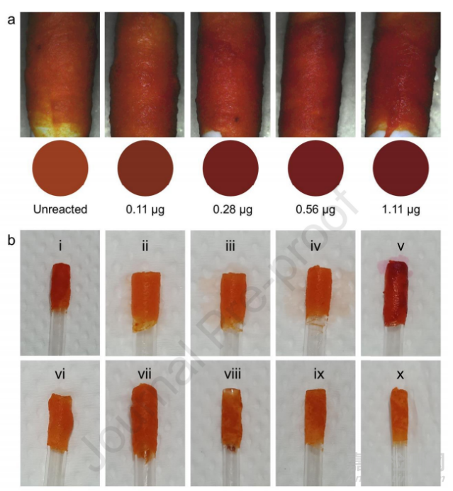 纖維拭子在精液斑定性檢測(cè)中的應(yīng)用展示了其作為初步篩查工具的潛力。研究通過(guò)將不同量的精液涂抹在棉布上,并使用PLA/PEO@PAN拭子進(jìn)行擦拭和檢測(cè)。結(jié)果表明,即使精液斑中僅含有0.11微克的鋅,拭子也能產(chǎn)生明顯的顏色變化,從而實(shí)現(xiàn)視覺(jué)上的定性檢測(cè)。此外,通過(guò)盲測(cè)實(shí)驗(yàn),非專業(yè)人員在識(shí)別精液斑方面表現(xiàn)出高達(dá)87%的一致性率,證明了該方法的可靠性和實(shí)用性。這些結(jié)果強(qiáng)調(diào)了PLA/PEO@PAN拭子在法醫(yī)鑒定和性侵犯案件調(diào)查中的潛在應(yīng)用價(jià)值。