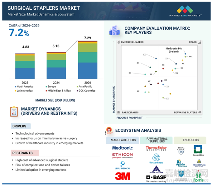 據(jù)MarketsandMarkets分析,手術(shù)縫合器市場(chǎng)預(yù)計(jì)將從 2024 年的 51.5 億美元增長(zhǎng)到 2029 年的 72.9 億美元,預(yù)測(cè)期內(nèi)的復(fù)合年增長(zhǎng)率為 7.2%。推動(dòng)市場(chǎng)增長(zhǎng)的因素包括手術(shù)縫合器的技術(shù)進(jìn)步、人們?cè)絹?lái)越重視微創(chuàng)手術(shù)而非傳統(tǒng)手術(shù),以及新興市場(chǎng)的醫(yī)療保健擴(kuò)張。手術(shù)縫合器市場(chǎng)按類(lèi)型、技術(shù)和可用性細(xì)分。根據(jù)類(lèi)型,手術(shù)縫合器市場(chǎng)可細(xì)分為線性縫合器、圓形縫合器、皮膚縫合器和其他縫合器。市場(chǎng)還根據(jù)技術(shù)分為手動(dòng)縫合器和電動(dòng)縫合器。根據(jù)可用性,手術(shù)縫合器市場(chǎng)分為一次性縫合器和可重復(fù)使用縫合器。美國(guó)食品及藥物管理局(FDA)嚴(yán)格的安全標(biāo)準(zhǔn)和優(yōu)惠的報(bào)銷(xiāo)政策等政府法規(guī)也為市場(chǎng)增長(zhǎng)提供了支持。這些因素促進(jìn)了手術(shù)縫合器在醫(yī)療保健系統(tǒng)中的應(yīng)用。