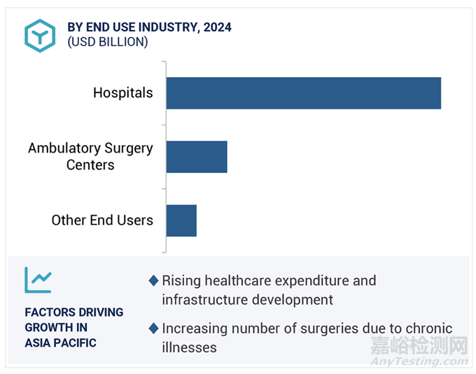 手術(shù)縫合器市場(chǎng)根據(jù)應(yīng)用分為腹部和骨盆外科、普通外科、心臟和胸部外科、整形外科以及其他外科應(yīng)用。腹部和盆腔手術(shù)在全球手術(shù)縫合器市場(chǎng)中占有最大份額,預(yù)計(jì)年復(fù)合增長(zhǎng)率最高。結(jié)腸直腸癌、肥胖癥、疝氣和胃腸道疾病等疾病的發(fā)病率越來(lái)越高,從而增加了腹部手術(shù),增加了對(duì)手術(shù)縫合器的需求。這些疾病大多需要復(fù)雜的手術(shù)干預(yù),如腸道切除術(shù)、胃旁路術(shù)和疝氣修復(fù)術(shù),而手術(shù)縫合器在有效縫合組織和提供穩(wěn)定吻合方面的作用非常重要。隨著全球常見(jiàn)疾病的增加,特別是老齡化和生活方式的改變,手術(shù)量也隨之增加。因此,對(duì)復(fù)雜的縫合器設(shè)備的精確性、安全性和可靠性的要求也越來(lái)越高,以保證為患者提供良好的治療效果、降低并發(fā)癥發(fā)生率,并在關(guān)鍵手術(shù)中取得巨大成功。