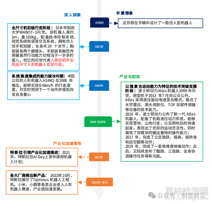 從 15 世紀(jì)達(dá)芬奇繪制出世界上第一份人形機(jī)器人手稿,到 1973 年早稻田大學(xué)研發(fā)出的世界第一款人形機(jī)器人 WABOT-1,再到特斯拉 0ptimus 引發(fā)對人形機(jī)器人產(chǎn)業(yè)化、商業(yè)化的探索,人形機(jī)器人產(chǎn)業(yè)從萌芽概念階段已經(jīng)進(jìn)入產(chǎn)業(yè)化落地前期。