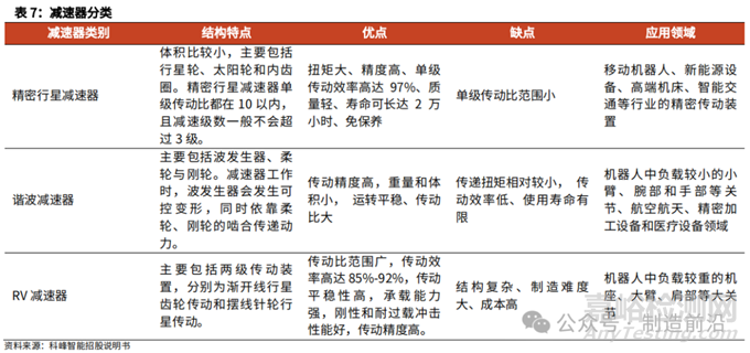 1. 減速器:減速器在人形機(jī)器人中起到降低電機(jī)轉(zhuǎn)速并增加輸出扭矩的作用,這對于提高機(jī)器人關(guān)節(jié)的力矩輸出和運(yùn)動精度至關(guān)重要。減速器能夠使電機(jī)在高轉(zhuǎn)速下運(yùn)行,同時確保關(guān)節(jié)運(yùn)動的平穩(wěn)性和精確性。主要應(yīng)用RV減速器、諧波減速器、行星減速器。