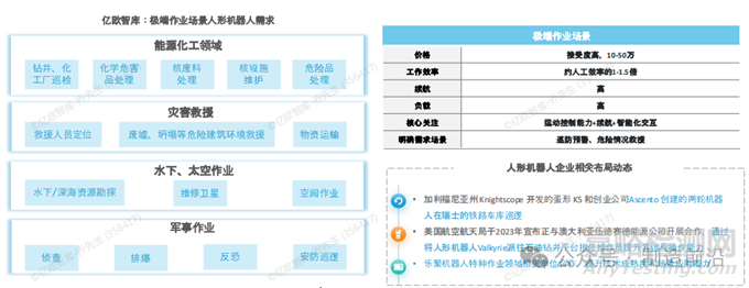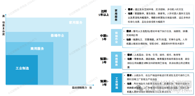 - 場景:能源化工,災(zāi)害救援、水下/太空、軍事作業(yè)等。人形機(jī)器人相關(guān)協(xié)調(diào)控制、智能分析、高強(qiáng)度材料等技術(shù)提升。