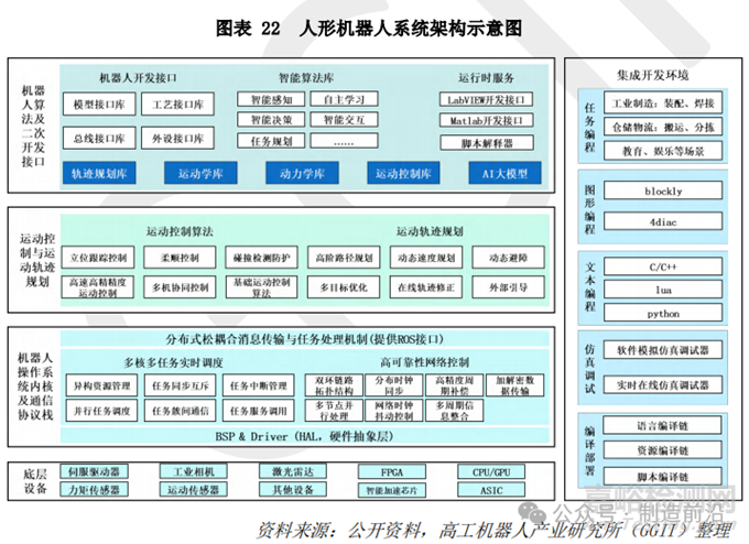 人形機(jī)器人軟件主要應(yīng)用于兩個部分:一是基于人工智能大模型的人形機(jī)器人“大腦”,主要體現(xiàn)在環(huán)境感知、行為控制、人機(jī)交互等方面;二是控制人形機(jī)器人運(yùn)動的“小腦”,主要體現(xiàn)在其運(yùn)動控制算法和網(wǎng)絡(luò)控制系統(tǒng)架構(gòu)。從算法庫的搭建、運(yùn)動控制系統(tǒng)的構(gòu)建操作系統(tǒng)到底層設(shè)備,人形機(jī)器人的系統(tǒng)架構(gòu)如下所示: