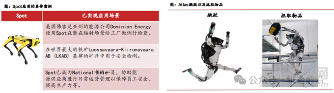 Boston Dynamics 成立于 1992年,是美國一家工程和機(jī)器人設(shè)計公司,是從麻省理工學(xué)院分拆出來的,曾服務(wù)于美國軍方機(jī)構(gòu)。2013、2017以及2021年公司先后被谷歌、軟銀以及現(xiàn)代汽車收購。機(jī)器狗Spot商業(yè)化初顯成效,2020年公司旗下Spot以7.45萬美元開售,開始初步商業(yè)化嘗試。Spot已有超過1000臺銷往了35個國家,主要被應(yīng)用于制造業(yè)、電力和公用事業(yè)、采礦、石油和天然氣等領(lǐng)域。兩足機(jī)器人Atlas為高動態(tài)機(jī)器人領(lǐng)軍代表,Atas于2013年首次亮相,其功能發(fā)展迅速。2017年Adas已經(jīng)可以學(xué)會臺階之間跳躍以及后空翻;2018年A1las學(xué)會了跑步,能夠邊跑邊越過障礙物、躍上臺階;2019年Atas掌握“體操”技巧,能夠連續(xù)的跳躍、翻滾、倒立;2023年Atlas在最新視頻中展現(xiàn)出了其手部靈活性(能抓能扔)。
