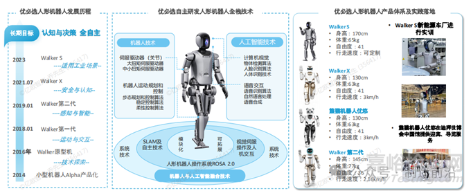 優(yōu)必選科技人形機(jī)器人產(chǎn)品五年四次迭代。2016年,優(yōu)必選發(fā)布雙足仿人服務(wù)機(jī)器人原型機(jī),經(jīng)歷五年四次迭代,在2021年推出最新人形服務(wù)機(jī)器人產(chǎn)品Walker x。Walker x高130厘米,重63kg,自由度41個,能夠?qū)崿F(xiàn)復(fù)雜地形自適應(yīng)平穩(wěn)快速行走,具備多模態(tài)情感交互仿人共情表達(dá)能力。優(yōu)必選CTO熊友軍表示,Walker正按照規(guī)劃推進(jìn)商業(yè)化應(yīng)用,最終的目標(biāo)是走入家庭。