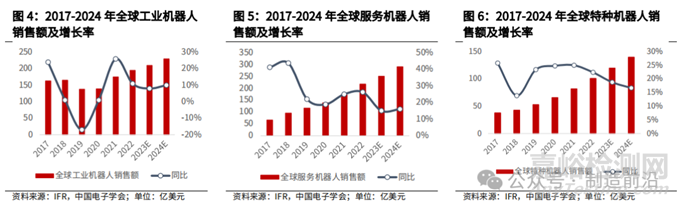 機(jī)器人整個大行業(yè)的市場規(guī)模在持續(xù)增長。根據(jù)中國電子學(xué)會組織編寫的《中國機(jī)器人產(chǎn)業(yè)發(fā)展報告(2022 年)》,預(yù)計到 2024 年全球機(jī)器人市場規(guī)模將有望突破 650 億美元,同比增長 12%;其中 2024 年工業(yè)機(jī)器人市場達(dá) 230 億美元,同比增長 10%;服務(wù)機(jī)器人市場達(dá) 290 億美元,同比增長 16%;特種機(jī)器人市場達(dá) 140 億美元,同比增長 16.7%。