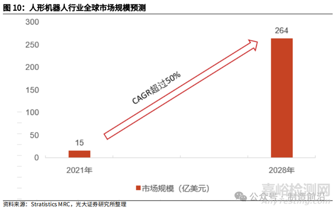 預(yù)計人形機(jī)器人的增速將大幅快于機(jī)器人行業(yè)的整體增速。根據(jù) StratisticsMRC 的數(shù)據(jù),2021 年全球人形機(jī)器人的市場規(guī)模為15 億美元,預(yù)計到 2028年將達(dá)到 264 億美元,2021-2028 年的 CAGR 達(dá) 50.5%;其中,分領(lǐng)域來看,Stratistics MRC 預(yù)計教育和娛樂領(lǐng)域的人形機(jī)器人復(fù)合增速最快,醫(yī)療保健領(lǐng)域占據(jù)最大的市場份額;分地區(qū)來看,Stratistics MRC 預(yù)計亞太地區(qū)的復(fù)合增速最快,北美地區(qū)的份額最高。