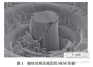 利用Thermo Helios G4 CX型FIB-SEM進(jìn)行試驗(yàn),該電鏡中電子束和離子束以52°角相交于一個(gè)共心點(diǎn),離子源采用液態(tài)金屬鎵離子源。該設(shè)備配備一個(gè)納米機(jī)械手,其尖端直徑為1~2μm,可沿x、y、z軸運(yùn)動(dòng),用該設(shè)備將試樣原位轉(zhuǎn)移至FIB專用載網(wǎng)上。此外,還配備了氣體注入系統(tǒng)(GIS-Pt),用于離子束誘導(dǎo)沉積及電子束誘導(dǎo)沉積,沉積后可作為保護(hù)層,并起到轉(zhuǎn)移試樣的作用。試樣臺(tái)水平安裝在FIB腔室中,具有平移、旋轉(zhuǎn)和傾斜等功能。TEM銅網(wǎng)夾安裝在38°預(yù)傾臺(tái)上,與離子束保持平行。選用小鼠股骨上皮質(zhì)骨的生物試樣進(jìn)行試驗(yàn),將試樣鑲嵌、粗磨、細(xì)磨、拋光后,采用離子濺射儀噴鍍Pt來改善試樣的整體導(dǎo)電性,隨后在FIB-SEM中采取頂端環(huán)狀刻蝕方法加工出微柱,其中最外環(huán)的直徑為30μm,這樣既有利于在進(jìn)行壓縮試驗(yàn)時(shí)納米壓痕儀里的光學(xué)顯微鏡對微柱進(jìn)行定位,也避免了壓頭運(yùn)動(dòng)時(shí)側(cè)壁接觸到試樣,最終加工成的微柱直徑約為5μm,高度約為10μm。再利用納米壓痕儀對微柱試樣進(jìn)行壓縮試驗(yàn),試驗(yàn)采用直徑為10μm的金剛石平壓頭,圖1為壓縮后微柱試樣的掃描電鏡(SEM)形貌。