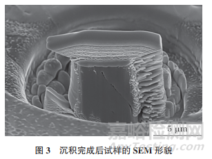 預(yù)加工完成后,需在微柱頂面沉積Pt保護(hù)層,對于該試樣而言,沉積Pt層的作用有:在加工過程中防止離子束對表面造成損傷,并在減薄時(shí)保護(hù)目標(biāo)區(qū)域;輔助納米機(jī)械手轉(zhuǎn)移試樣。由于壓縮后微柱直徑僅為6μm,若分別犧牲兩側(cè)1μm將試樣寬度固定在銅網(wǎng)上,則無法最大程度保留TEM試樣的有效區(qū)域,因此為了保證微柱的大部分區(qū)域均在薄區(qū)內(nèi),需要借助沉積在微柱兩側(cè)的Pt 搭載在銅網(wǎng)上。因此在離子束下對目標(biāo)位置沉積Pt時(shí),選擇電壓為30kV,束流為0.23nA,設(shè)置圖形長度為12μm,寬度為2μm,即兩邊長度均超出微柱3 μm,沉積時(shí)間根據(jù)微柱表面Pt層厚度(約為2μm)及兩側(cè)Pt的堆積情況而定。圖3為沉積完成后試樣的SEM形貌,可以看出左右兩側(cè)分別堆積了一部分Pt。