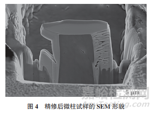 選用FIB的電壓為30kV,束流為9.3nA,利用常規(guī)截面(RCS)模式將需要加工的試樣前后兩側(cè)掏空,由于微柱高度較高,因此加工圖形的長度、寬度、高度分別為20,20,15μm。兩側(cè)掏空后降低束流至2.5nA,首先在54°時(shí)用CCS模式對試樣正面進(jìn)行精修,在精修時(shí),每2s觀察一次電子束,盡量保留微柱中的裂紋。為了能直觀看到試樣另一側(cè)的精修情況,將試樣臺(tái)轉(zhuǎn)回0°,水平旋轉(zhuǎn)180°后再次傾轉(zhuǎn)至54°,對另一側(cè)進(jìn)行精修,精修后微柱試樣的SEM形貌如圖4所示,最終保留約1.5μm的厚度。
