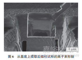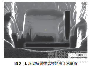 將試樣臺(tái)轉(zhuǎn)回0°,離子束觀察角度為180°,在束流為2.5nA時(shí)用幾個(gè)矩形(rectangle) 圖形并聯(lián)刻蝕模式對試樣進(jìn)行L形切,L形切的目的是將薄片試樣右側(cè)和底部切斷,保留左側(cè)和基底連接部分做支撐,形成一個(gè)懸臂狀試樣(見圖5)。由于微柱兩側(cè)均為Pt,且Pt外側(cè)懸空,考慮到Pt和試樣結(jié)合不牢固,為了避免試樣與基體斷裂,加工時(shí)采用右側(cè)和底部切割的L形切,保證在刻蝕過程中試樣不會(huì)因?yàn)樽灾貙?dǎo)致連接處斷開,而使試樣掉落。為了防止因試樣過高及離子束切割時(shí)存在一定的夾角而導(dǎo)致未切斷的情況,L形切結(jié)束后可將試樣臺(tái)傾轉(zhuǎn)20°,觀察薄片試樣底部是否與基體完全脫開,若未脫離,則轉(zhuǎn)回0°繼續(xù)加工底邊,直至完全脫離。