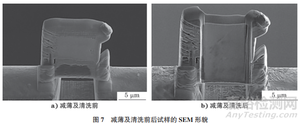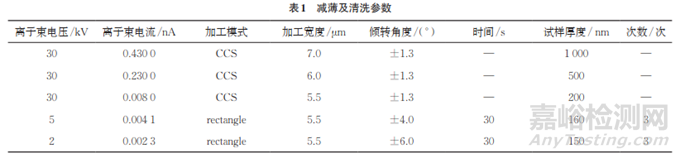 減薄是微柱TEM試樣制備的關(guān)鍵階段,由于試樣上存在裂紋等缺陷,因此減薄時(shí)需要注意兩個(gè)方面:采用對稱切削的方式對兩面進(jìn)行均勻減薄,這樣兩側(cè)交替可以使應(yīng)力互相抵消,降低試樣變形幾率;逐步減小離子束加工的電壓束流、深度及加工區(qū)域的寬度。減薄時(shí)銅網(wǎng)轉(zhuǎn)回0°并水平旋轉(zhuǎn)180°,即正對離子束位置,將目標(biāo)區(qū)域調(diào)整至共心高。由于該試樣硬度較低,根據(jù)經(jīng)驗(yàn),減薄時(shí)將試樣臺(tái)傾轉(zhuǎn)±1.3°,采用CCS 模式分別完成兩側(cè)的等深度減薄過程,該試樣需在150nm(厚度)左右觀察內(nèi)部礦化膠原纖維走向排布,因此粗減薄后TEM試樣厚度保留約200nm。減薄時(shí),兩側(cè)出現(xiàn)的白邊不一定是上薄下厚導(dǎo)致的,可能是試樣導(dǎo)電性較差所致,不能完全消除。高能離子束會(huì)在試樣表面產(chǎn)生一層非晶層,而加速電壓是影響非晶層厚度的主要因素,為了消除30kV電壓對試樣表面造成的損傷,需逐級降低離子束電壓,對試樣表面進(jìn)行清洗。減薄及清洗參數(shù)如表1所示,減薄及清洗前后試樣的SEM形貌如圖7所示。