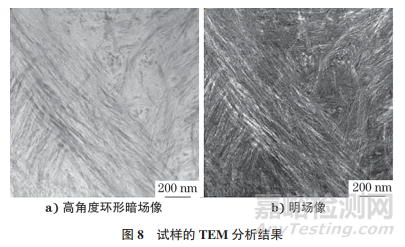 使用TEM對制備的試樣進(jìn)行觀察,結(jié)果如圖8所示。由圖8可知:試樣厚度均勻,沒有“窗簾”效應(yīng),可觀察到膠原纖維走向,表明制備的TEM試樣厚度達(dá)到要求,且損傷層較少。