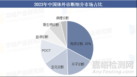 中國IVD市場規(guī)模在各個賽道上相對分散,免疫診斷為市場規(guī)模占比最大的細分賽道。免疫診斷是以免疫學(xué)為基礎(chǔ),利用抗原與抗體互相結(jié)合的特異性反應(yīng)來進行定性或者定量的診斷。經(jīng)過技術(shù)迭代更新,免疫診斷已超越生化診斷,快速成長為我國體外診斷市場規(guī)模最大的細分市場,并且診斷技術(shù)多樣,應(yīng)用覆蓋范圍較廣,到2023年所占我國IVD市場份額達到33%。然而,IVD市場的快速發(fā)展也伴隨著激烈的競爭和技術(shù)創(chuàng)新的壓力,特別是對于那些尋求差異化和顛覆性創(chuàng)新的企業(yè)而言。