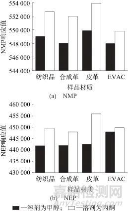 童鞋主要用4種材料為紡織品、合成革、皮革、EVAC。我國2019年12月31日發(fā)布的推薦性標(biāo)準(zhǔn)GB/T 38349—2019 《膠鞋、運動鞋N-甲基吡咯烷酮含量的測定》中關(guān)于紡織材料、合成革、皮革材料中NMP的測定采用的溶劑是甲醇。GB/T 38409—2019《皮革 化學(xué)試驗 N-甲基吡咯烷酮(NMP)和N-乙基吡咯烷酮(NEP)的測定》中關(guān)于皮革材料中NMP和NEP的測定采用的溶劑是丙酮??紤]到NMP和NEP均為溶解性較好的溶劑,可以與甲醇、乙醚、丙酮、乙酸乙酯、氯仿和苯等多種溶劑互溶,因此試驗溶劑選擇甲醇或者丙酮。同時進(jìn)行了紡織品、合成革、皮革、EVAC在甲醇和丙酮中NMP和NEP的加標(biāo)對比試驗,從童鞋中選取以上4種材質(zhì),該材質(zhì)均為已驗證過不含NMP和NEP的陰性樣品,按照取樣要求粉碎樣品至5 mm以下,每種材質(zhì)分別稱取兩份1 g粉碎后的樣品,用5 mg/L的NMP和NEP混合標(biāo)準(zhǔn)溶液做加標(biāo)試驗,兩份提取溶劑分別為甲醇和丙酮,50 ℃超聲60 min,測試后對比響應(yīng)值,結(jié)果見圖1。由圖1可見,對于NMP和NEP,4種材料在甲醇和丙酮中提取后響應(yīng)值對比結(jié)果為在丙酮中響應(yīng)值相對較高,甲醇中相對較低,NMP和NEP在丙酮作為溶劑時目標(biāo)物色譜峰平滑對稱,分離度較好,雜質(zhì)峰較少,因此選用丙酮作為提取溶劑。