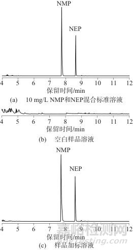 按照上述儀器條件,將10 mg/L NMP和NEP混合標(biāo)準(zhǔn)溶液、空白樣品的萃取液、加標(biāo)樣品(加標(biāo)濃度為5 mg/L)的萃取液進(jìn)樣分析,所得分離色譜圖見圖2。由圖2可見,標(biāo)準(zhǔn)溶液和加標(biāo)溶液中NMP和NEP可以完全分離,分離度良好,同時空白樣品中NMP和NEP的響應(yīng)值很小,對檢測結(jié)果無影響。