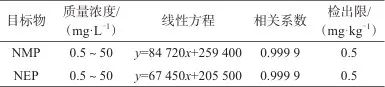 表2 NMP和NEP的線性范圍、線性方程、相關(guān)系數(shù)和方法檢出限