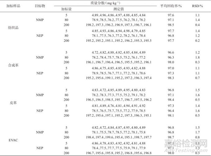 在1.2儀器工作條件下,對1.3所配制的系列混合標(biāo)準(zhǔn)工作溶液進(jìn)行測定,以各組分的質(zhì)量濃度比為橫坐標(biāo)、對應(yīng)色譜峰面積為縱坐標(biāo)進(jìn)行線性擬合,NMP和NEP的線性范圍均為0.5~50 mg/L。取空白童鞋樣品中紡織品、合成革、皮革和EVAC,分別進(jìn)行NMP和NEP低濃度的加標(biāo)試驗,逐級降低加標(biāo)濃度至儀器中所得信噪比為3∶1時所對應(yīng)的濃度為方法檢出限。紡織品、合成革、皮革和EVAC中NMP和NEP的方法檢出限分別為0.49、0.48、0.50、0.49 mg/kg,因此確定0.5 mg/kg為方法檢出限。NMP和NEP的線性范圍、線性方程、相關(guān)系數(shù)和方法檢出限見表2。由表2知,NMP和NEP的線性相關(guān)系數(shù)均為0.999 9,表明線性良好,滿足測試要求。