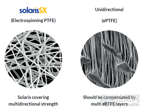 Solaris SX的覆膜采用靜電紡絲制備,相比于傳統(tǒng)的ePTFE膜,絲線方向性顯示出無規(guī)則性。從而實(shí)現(xiàn)不透水、防止組織向內(nèi)生長、最大化通暢以及減少再狹窄效果。
