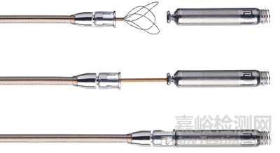 不僅如此,雅培還開發(fā)了專用的AVEIR輸送和取出導(dǎo)管,其為一種帶偏轉(zhuǎn)機構(gòu)的可操縱輸送導(dǎo)管,獨特的三環(huán)圈套結(jié)構(gòu)能夠和AVEIR進行裝配,如下圖所示: