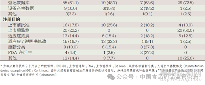 由于RWD 存在人群異質(zhì)性、數(shù)據(jù)的多樣化、數(shù)據(jù)標(biāo)準(zhǔn)不夠統(tǒng)一的特點(diǎn),因此數(shù)據(jù)采集及其質(zhì)量控制非常重要。從上述分析結(jié)果可以看出,將RWE 作為主要或唯一證據(jù)時(shí),多采用前瞻性的數(shù)據(jù)采集方式;在研究設(shè)計(jì)方面,這些案例以隊(duì)列研究、單臂研究和橫斷面研究較為常見。在統(tǒng)計(jì)分析方面,通過公開文件未能獲取大部分研究的細(xì)節(jié),但從可獲得的信息中可以發(fā)現(xiàn),對(duì)相關(guān)結(jié)局進(jìn)行描述的RWE 占到了相當(dāng)?shù)谋壤?。這些以描述為主要分析方法的研究,涉及的醫(yī)療器械產(chǎn)品種類較多,與心血管疾病相關(guān)的醫(yī)療器械(4 個(gè)),多為手術(shù)操作過程中的輔助器械,例如液氮冷凍治療手術(shù)系統(tǒng)、輔助控制腹腔鏡儀器系統(tǒng)等。