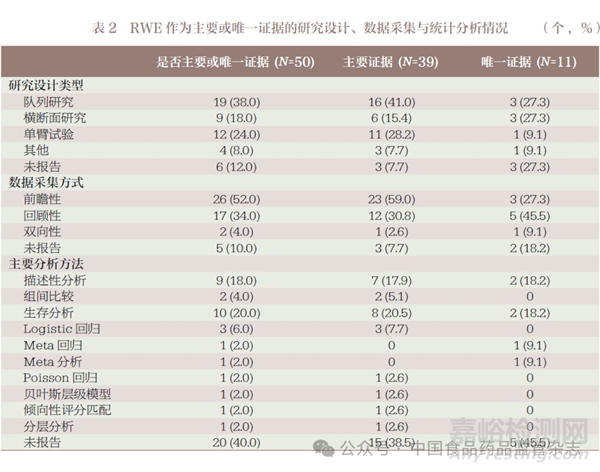 使用RWE 作為上市前主要或唯一證據(jù)來源的50 例產(chǎn)品中,隊(duì)列研究19 例(38.0%)、橫斷面研究9 例(18.0%)和單臂試驗(yàn)12 例(24.0%),6 例(12.0%)研究未報(bào)告研究設(shè)計(jì)類型,其他的研究設(shè)計(jì)類型還包括成組序貫設(shè)計(jì)、Meta 分析、多臂研究等。在統(tǒng)計(jì)分析方面,20 個(gè)產(chǎn)品沒有報(bào)告使用的統(tǒng)計(jì)方法,其余的研究中有9 個(gè)(18.0%)案例采用描述性分析的方法,計(jì)算了各組的人數(shù)和構(gòu)成比,但沒有進(jìn)行組間比較和假設(shè)檢驗(yàn),2 個(gè)產(chǎn)品采用Fisher 確切概率法和Wilcoxon 秩和檢驗(yàn)進(jìn)行組間比較。10 個(gè)產(chǎn)品采用生存分析的方法,包括Cox 回歸、競(jìng)爭(zhēng)風(fēng)險(xiǎn)分析、 Kaplan Meier 方法等,還有1 項(xiàng)研究結(jié)合使用傾向性評(píng)分匹配的方法。使用Logistic 回歸分析的有3 個(gè)產(chǎn)品,其中1 個(gè)產(chǎn)品研究結(jié)合使用廣義估計(jì)方程。使用Meta 回歸、Meta 分析、泊松回歸、貝葉斯層級(jí)模型、傾向性評(píng)分匹配和分層分析的方法各有1個(gè)產(chǎn)品,見表2。