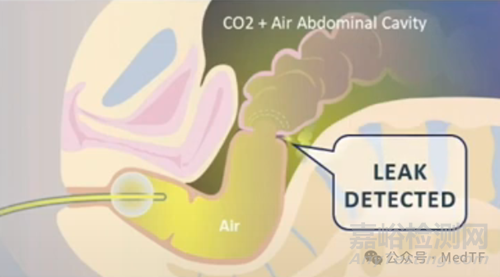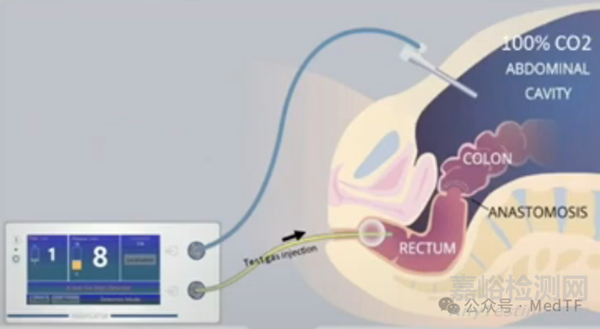 Qaelon既可以作為氣腹機(jī)也可以作為吻合口漏檢測設(shè)備,當(dāng)作為吻合口漏檢測設(shè)備時。需要將球囊導(dǎo)管從肛門插入到結(jié)直腸,并注入空氣。一旦吻合口有泄漏,就能改變腹腔氣體成分,從100%二氧化碳變成二氧化碳+空氣。Qaelon通過其專有數(shù)字傳感器和先進(jìn)的算法能夠快速識別吻合口是否存在泄漏。
