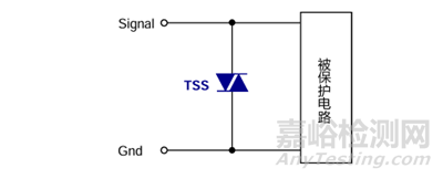 TSS是一種開關(guān)型過電壓保護(hù)器件,導(dǎo)通后電壓較低,不能單獨應(yīng)用于較高的電源線保護(hù)。