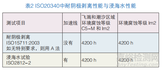 ISO20340中要求耐陰極剝離性能與浸海水性能如表2。