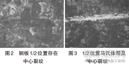 在鋼板探傷不合部位取樣進(jìn)行金相和夾雜物分析。圖2顯示,鋼板1/2位置存在中心裂紋,此裂紋大部分是沿晶裂紋,少部分是穿晶裂紋,此類裂紋是直接導(dǎo)致出現(xiàn)分層的根本原因。圖3顯示鋼板1/2位置同時(shí)存在異常組織帶和貫穿裂紋,說明裂紋和馬氏體存在直接關(guān)系。