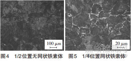 圖4顯示鋼板厚度1/2位置無網(wǎng)狀鐵素體,圖5顯示鋼板厚度1/4及近表位置存在網(wǎng)狀鐵素體。網(wǎng)狀鐵素體形成在奧氏體化的亞共析鋼緩慢冷卻的過程中,當(dāng)溫度低于Ar3時(shí),碳和合金元素的擴(kuò)散導(dǎo)致先共析相沿奧氏體晶界析出,從而形成網(wǎng)狀鐵素體。鋼板1/2處無網(wǎng)狀鐵素體,說明1/2位置的化學(xué)成分高于亞共析鋼,與鋼坯偏析有關(guān)。