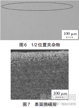圖6顯示鋼板1/2位置存在A類2.0級(jí)別夾雜物,說明鋼水純凈度較差,也增加了鋼板內(nèi)部裂紋發(fā)生的概率和風(fēng)險(xiǎn)。圖7顯示鋼板表面存在脫碳層,完全脫碳層和總脫碳層厚度分別為0.06mm和0.26mm,結(jié)合存在網(wǎng)狀鐵素體的說明存在過度加熱問題。