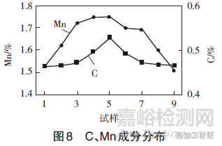 在同一位置的取9塊成分試樣,并進(jìn)行磨削加工減薄處理。從上近表位置1至下近表位置9逐塊減薄1mm,使用光譜法檢驗(yàn)成分,進(jìn)行分布對(duì)比。檢驗(yàn)結(jié)果表明,在1/2位置的C、Mn含量顯著高于近表位置。圖8顯示C、Mn偏析從近表面至中心位置偏析程度差異明顯。