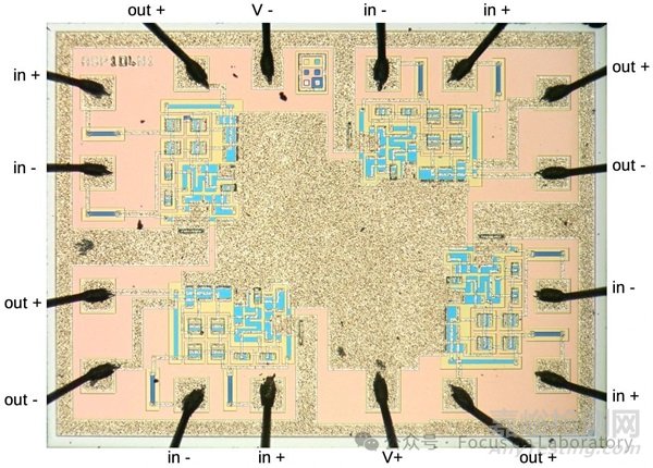 該芯片上有四個(gè)電路塊,分別對(duì)應(yīng)四個(gè)比較器。芯片的大部分區(qū)域都未被使用,尤其是中間的大片金屬區(qū)域。由于這個(gè)芯片的電路相對(duì)簡單,所以僅使用了一小部分可用空間。