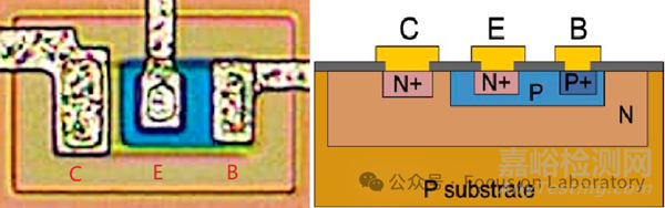 橙色和藍(lán)色是經(jīng)過不同摻雜的硅區(qū)域,分別形成N區(qū)和P區(qū)。有斑點(diǎn)的區(qū)域是硅片頂部的芯片金屬層,這些金屬層構(gòu)成了連接到晶體管的集電極、發(fā)射極和基極的導(dǎo)線。右側(cè)是一個(gè)剖面圖,大致展示了晶體管的構(gòu)造。實(shí)際構(gòu)造比你在書本上看到的NPN晶體管結(jié)構(gòu)要復(fù)雜得多,通過仔細(xì)觀察,可以在裸片上區(qū)分出發(fā)射極、基極和集電極,基極區(qū)域環(huán)繞著發(fā)射極,形成一個(gè)藍(lán)色矩形,集電極觸點(diǎn)更大且位于一側(cè)。發(fā)射極(E)導(dǎo)線連接到N?型硅。在其下方是一個(gè)連接到基極觸點(diǎn)(B)的P層。再下方是一個(gè)(間接)連接到集電極(C)的N?層。