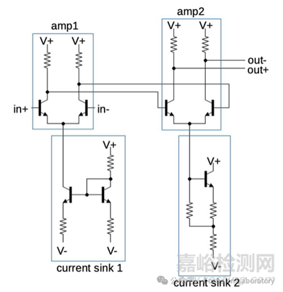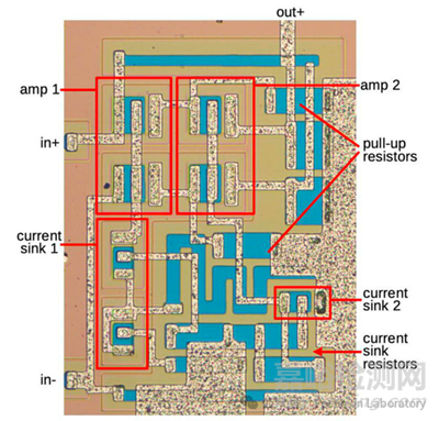 下面的圖表展示了芯片上的電路,它與上面的原理圖相對(duì)應(yīng)。紅色方框表示兩個(gè)放大級(jí)的晶體管及其相關(guān)的電流源。其他元件是電阻,它們顯示為藍(lán)色矩形。金屬層中的布線將這些元件連接在一起,同時(shí)也連接了左側(cè)的輸入和頂部的輸出。