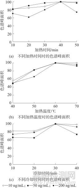 圖2 不同加熱時間、加熱溫度及冷卻時間時的色譜峰面積