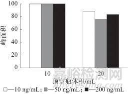 配10、50、200 ng/mL的加標(biāo)血液樣品各兩份,分別置于10、20 mL的頂空瓶中,按1.4方法操作,以最大色譜峰面積為100%基準(zhǔn)計算回收率,不同頂空瓶體積時的色譜峰面積見圖4。由圖4可以看出,頂空瓶體積越大,瓶內(nèi)HCN分散體積越大,相同的進(jìn)樣體積內(nèi)HCN的含量越低,從而導(dǎo)致回收率降低。由于這兩種規(guī)格的頂空瓶均為實驗室常用,小于10 mL的頂空瓶比較少見,因此在滿足實驗要求的基礎(chǔ)上未考察容量更小的頂空瓶,最終采用10 mL的頂空瓶。