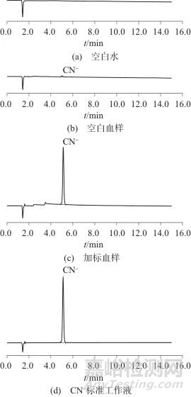 將10份不同人的空白血、取其中1份正常粘稠度的空白血加CN-標(biāo)準(zhǔn)工作液適量,按1.4方法處理,和空白水、CN-標(biāo)準(zhǔn)工作液一起進(jìn)樣分析,考察色譜峰形、空白血中雜質(zhì)和內(nèi)源性氰化物對目標(biāo)物的影響。圖5為CN-的色譜圖。