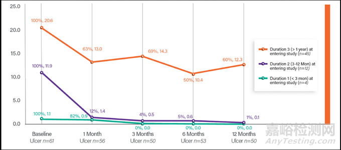 在患有靜脈潰瘍(CEAP C6)的受試者中,術(shù)后一年潰瘍面積中位數(shù)減少了87%。這一結(jié)果表明,VenoValve 對于改善深靜脈CVI患者的靜脈潰瘍具有顯著的療效。