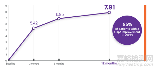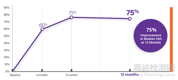 1年臨床結(jié)果顯示:平均反流時間顯著下降 54%;平均疾病嚴(yán)重程度評分(rVCSS)顯著下降 56%;平均疼痛評分(VAS)顯著下降 76%。