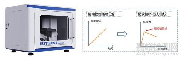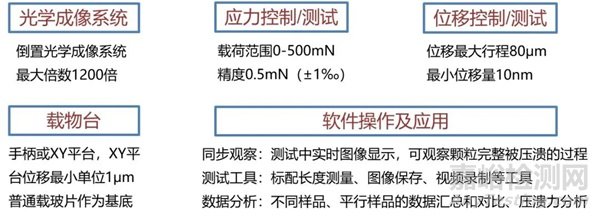 SPFT設(shè)備(圖2左)由光學(xué)顯微鏡、壓力測(cè)量系統(tǒng)、位移測(cè)量系統(tǒng)、力位移控制系統(tǒng)組成,通過(guò)高精度的位移和壓力控制,可采集壓頭(平面大小50μm左右,可定制)加載到單個(gè)顆粒上后的壓力-位移曲線,從曲線的突變點(diǎn)分析顆粒壓潰力(圖2右)。測(cè)試過(guò)程中,可以借助光學(xué)顯微鏡觀察顆粒在壓前壓后的形態(tài)、測(cè)試顆粒的尺寸信息等。