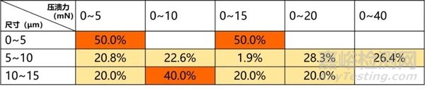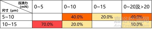 我們按照不同樣品類(lèi)型、特定尺寸范圍、特定壓潰力范圍做了壓潰力分布比例的統(tǒng)計(jì)。以下統(tǒng)計(jì)來(lái)源于實(shí)驗(yàn)室的測(cè)試結(jié)果,圖表顏色標(biāo)注方式按照?qǐng)D10執(zhí)行。