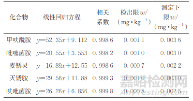 以3倍和10倍的信噪比(S/N)計(jì)算檢出限(3S/N)和測(cè)定下限(10S/N),結(jié)果見(jiàn)表5。