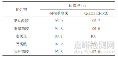 目前用于農(nóng)藥殘留的凈化方法主要有固相萃取法和QuEChERS法。其 中QuEChERS法基于基質(zhì)凈化劑 PSA、GCB和C18進(jìn)行聯(lián)合凈化。土壤中農(nóng)藥的萃取過(guò)程中,各類雜質(zhì)不可避免地也被萃取出來(lái),通過(guò)凈化劑PSA可有效去除土壤萃取液中脂肪酸和酚類等雜質(zhì),這些雜質(zhì)容易在色譜柱上聚集,影響色譜柱的效能和靈敏度;GCB可以去除大分子雜質(zhì);C18用于凈化脂溶性強(qiáng)的非極性成分。試驗(yàn)考察了不同凈化方法(固相萃取法、QuEChERS法)對(duì)土壤中5種琥珀酸脫氫酶抑制劑類殺菌劑回收率的影響,結(jié)果見(jiàn)表4。