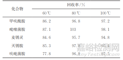 萃取溫度、壓力、加熱時(shí)間等因素是ASE的重要參數(shù),其中萃取溫度是影響萃取效果最為顯著的因素,溫度升高可提高溶劑對(duì)目標(biāo)物的溶解能力,使目標(biāo)物與基質(zhì)更好地分離,進(jìn)而縮短萃取時(shí)間;但溫度過(guò)高會(huì)使熱不穩(wěn)定目標(biāo)物發(fā)生分解,萃取率降低。其他萃取條件保持不變,試驗(yàn)考察了不同萃取溫度(60,80,100℃)對(duì)土壤中5種琥珀酸脫氫酶抑制劑類殺菌劑(加標(biāo)量0.2mg·L−1)回收率的影響,結(jié)果見(jiàn)表3。