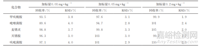 按照試驗(yàn)方法對(duì)不含上述5種琥珀酸脫氫酶抑制劑類殺菌劑的土壤樣品進(jìn)行0.01,0.05,0.2mg·kg−1等3個(gè)濃度水平的加標(biāo)回收試驗(yàn),每個(gè)濃度水平平行配制6份,計(jì)算回收率和測(cè)定值的相對(duì)標(biāo)準(zhǔn)偏差(RSD),結(jié)果見(jiàn)表6。