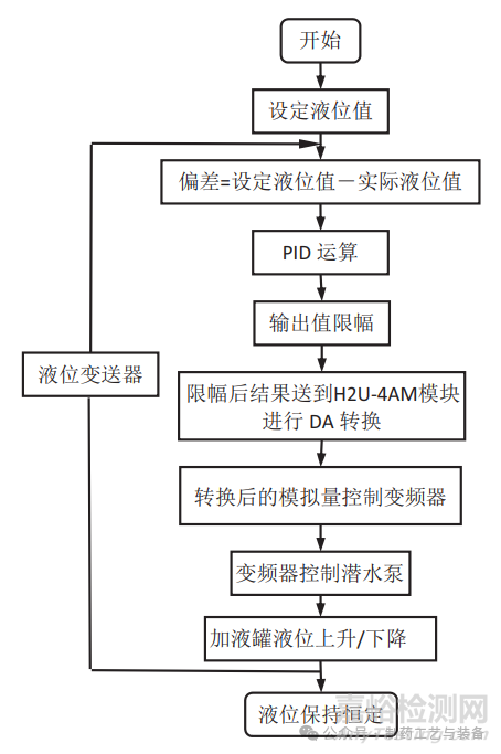 閉環(huán)加熱工序為系統(tǒng)的第二部分模塊,為確保灌裝液體的均勻性和穩(wěn)定性,利用 PLC 對藥液進行恒溫恒液位控制。系統(tǒng)對加熱絲進行加熱,不同顏色的燈光顯示不同溫度階段,變頻器控制潛水泵實現(xiàn)恒液位控制,液位保持在設(shè)定的某一高度上。恒液位控制采用 PID 算法,根據(jù)液位設(shè)定值與液位反饋值相減得到的偏差,經(jīng) PID 模塊運算后,得出運算結(jié)果,系統(tǒng)將運算結(jié)果通過模擬量H2U-4AM模塊轉(zhuǎn)換成相應(yīng)的電壓值,控制變頻器,系統(tǒng)可根據(jù)液位偏差結(jié)果,柔性調(diào)控潛水泵的抽液量,保證加液罐充裝液體液位高度的恒定。液位控制工作流程如圖9所示。